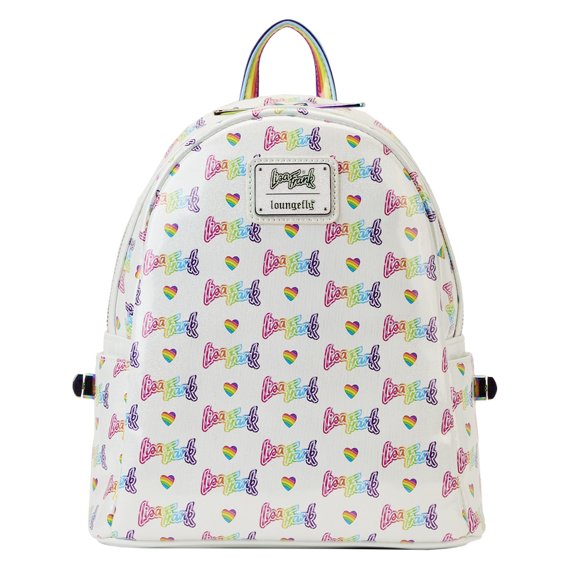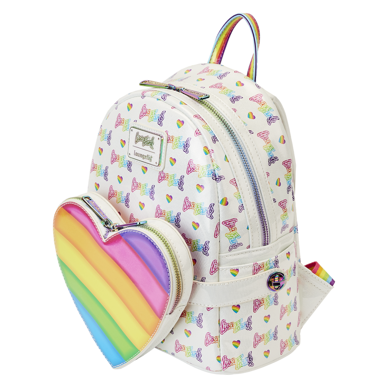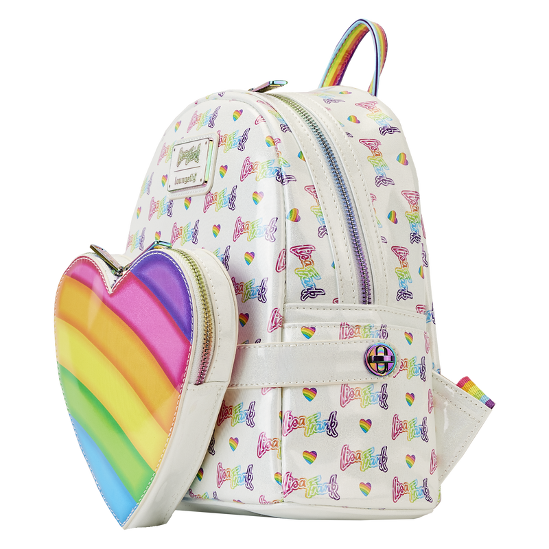 Take off with flying colors! Bring cheerful splashes of bright rainbow hues wherever you go with our Loungefly Lisa Frank Rainbow Heart Mini Backpack.