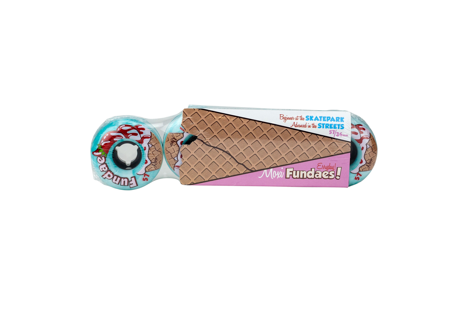 With these wheels, everyday is FUNDAE! A smooth blend of urethane that rolls from street to park. Fundae wheels are 57 mm in diameter and 34mm wide and come in the following cream swirl colors: Lavender, Bubble Gum (pink), Birthday Cake (blue) and Creme de Menthe (teal green). 92A Hardness.
