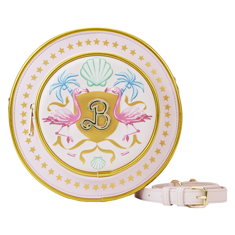 Think pink and head to Barbie Land™ in style. This Loungefly Mattel Barbie™: The Movie Logo Crossbody Bag is full of fun, summery beach vibes and on-trend colors. This fully figural bag, in the shape of a circle, showcases an “inner-circle” front zipped pocket. This pocket features a shiny gold emblem of Barbie’s logo, against a golden shield. Twin flamingos appear on either side of the shield, along with pastel-colored shells and palm trees. Gold stars frame the scene as well. An allover print of the Barbie logo—in pink—adds a signature touch on the back. This bag is just the right size for securing your daily essentials, whether you’re rollerblading in the sun or seeking that picture-perfect spot on the beach.