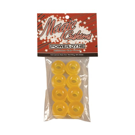 Unique to PowerDyne Magic Cushions is the Power Assist formula for total performance. Made from high-quality urethane, Magic Cushions (also referred to as "bushings") retain energy and release it when you need it most. Just like shocks on a car, Magic Cushions soak up the imperfections of the surface, keep you connected to the road ahead through enhanced feedback, load up when pressed to the limit, and then release your stored power in a forceful yet predictable manner. Available in four colors/hardnesses, they are the most responsive cushions available for your skating skills.