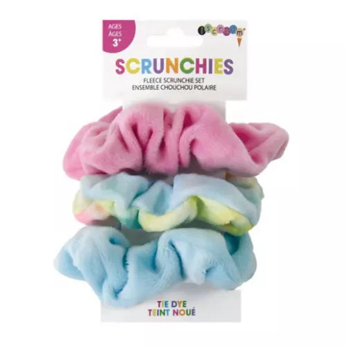 Add a punch of color to your ponytail with our pastel tie dye scrunchie set. This fleece scrunchie 3-pack features pretty pink, soft blue, and rainbow-colored pastel tie dye scrunchies. The perfect gift for fashionistas of all ages, these scrunchies make great stocking stuffers and party favors.